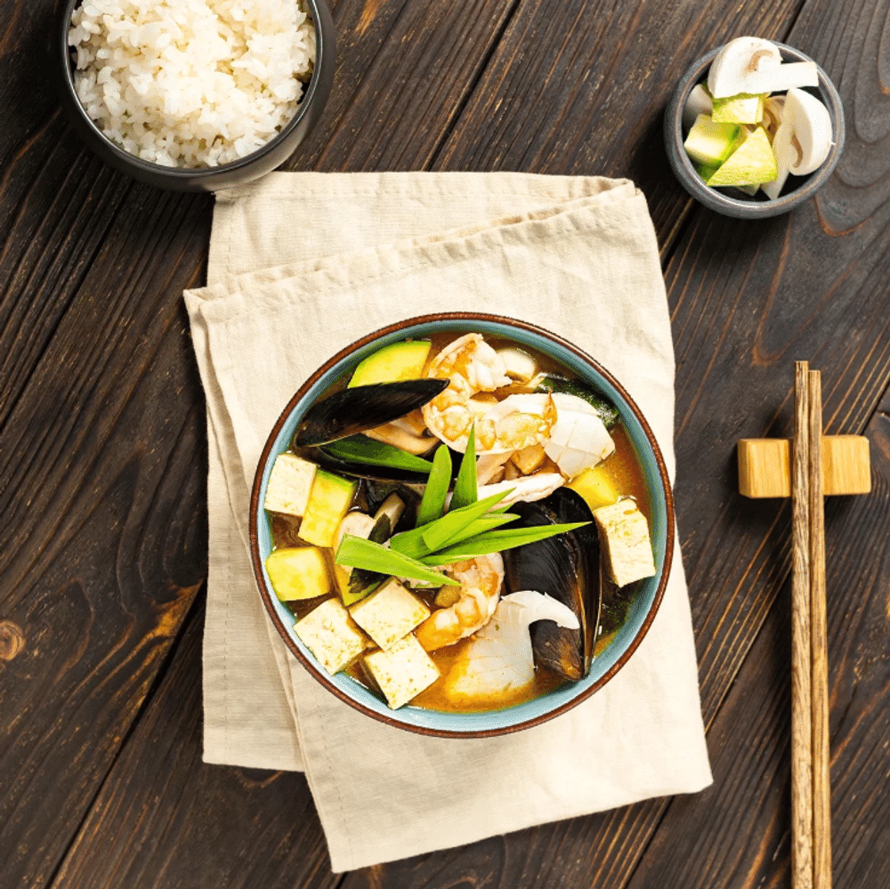 Soup with soy paste, tofu, zucchini, mushrooms, garlic, seafood (peeled king prawns, mussels, squid). Served with rice.