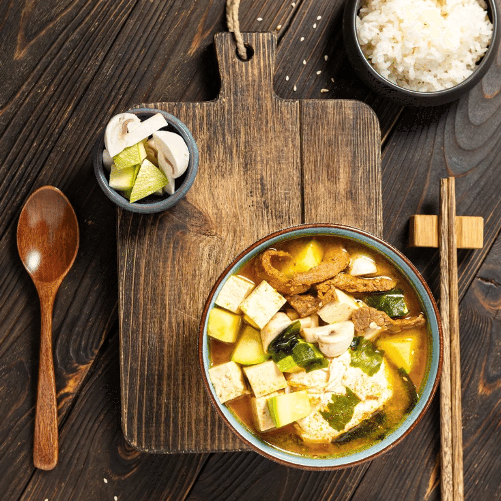 Суп с соевой пастой, тофу, кабачком, шампиньонами, чесноком, куриной грудкой и яйцом пашот. Подается с рисом. Soup with soy paste, tofu, zucchini, mushrooms, garlic, meat and poached egg. Served with rice.
