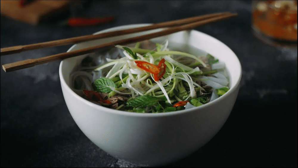 Классический вьетнамский суп на основе говяжьего бульона с рисовой лапшой и тонко нарезанным мясом A classic Vietnamese soup made with beef broth, rice noodles, and thinly sliced meat