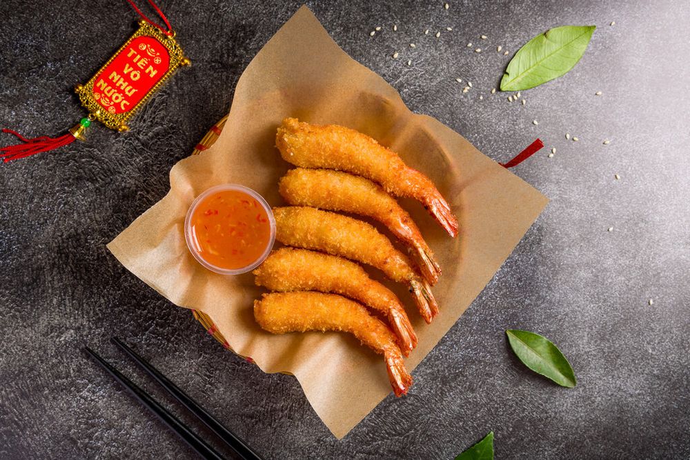 Королевские креветки в панировке из сухарей , обжаренные в хрустящем кляре., подается с фирменным соусом.