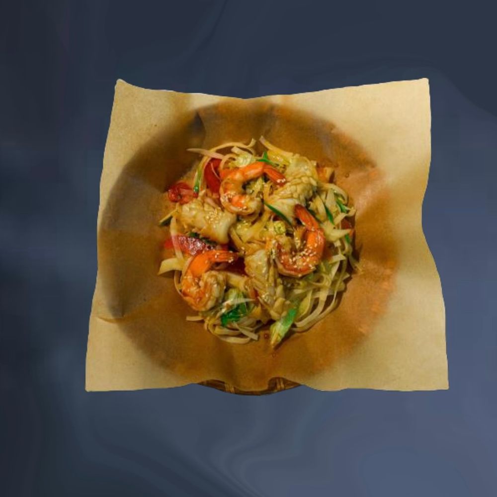 Обжаренная рисовая лапша с морепродуктами(креветки и кальмары) и овощами в пикантном фирменном соусе Fried rice noodles with seafood (shrimp and squid) and vegetables in a spicy signature sauce