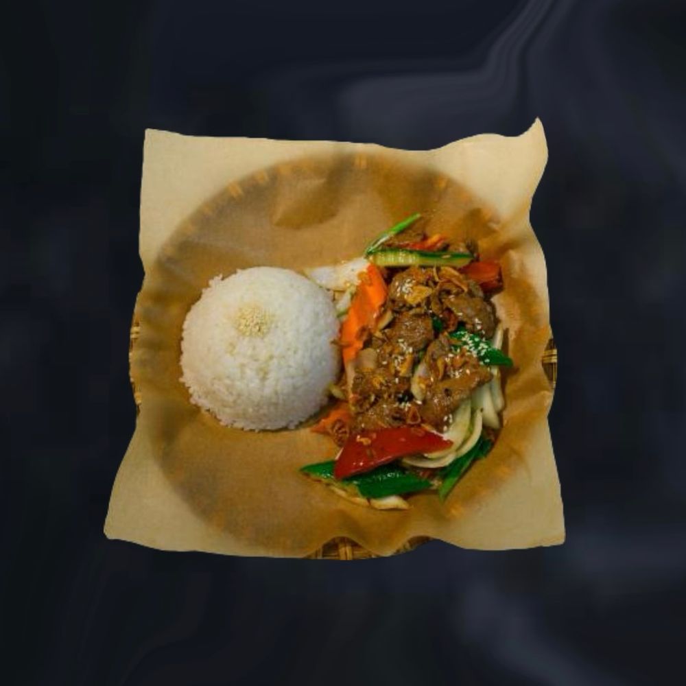 Горячее блюдо с рисом, морепродуктами( креветки и кальмары) и овощами в фирменном пикантном соусе A hot dish with rice, seafood (shrimp and squid), and vegetables