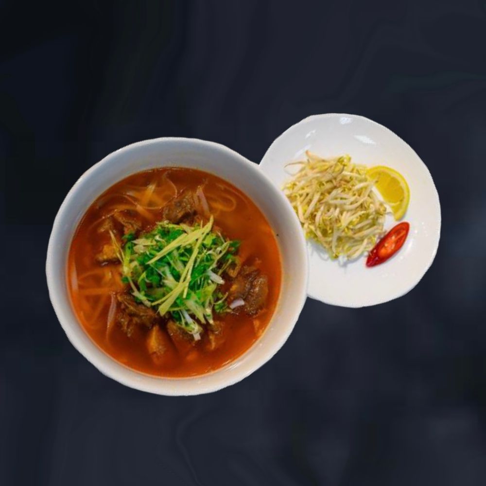 Традиционный суп с говядиной в специальных специях , рисовой лапшой и зеленью