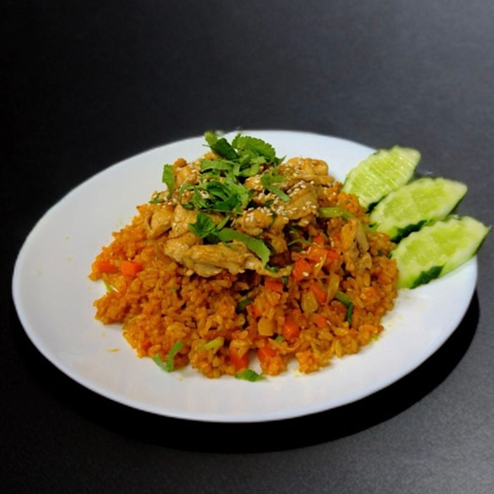 Традиционное вьетнамское блюдо, жареный рис с овощами, морепродуктами в в фирменном пикантном соусе A traditional Vietnamese dish, fried rice with vegetables, seafood, and soy sauce