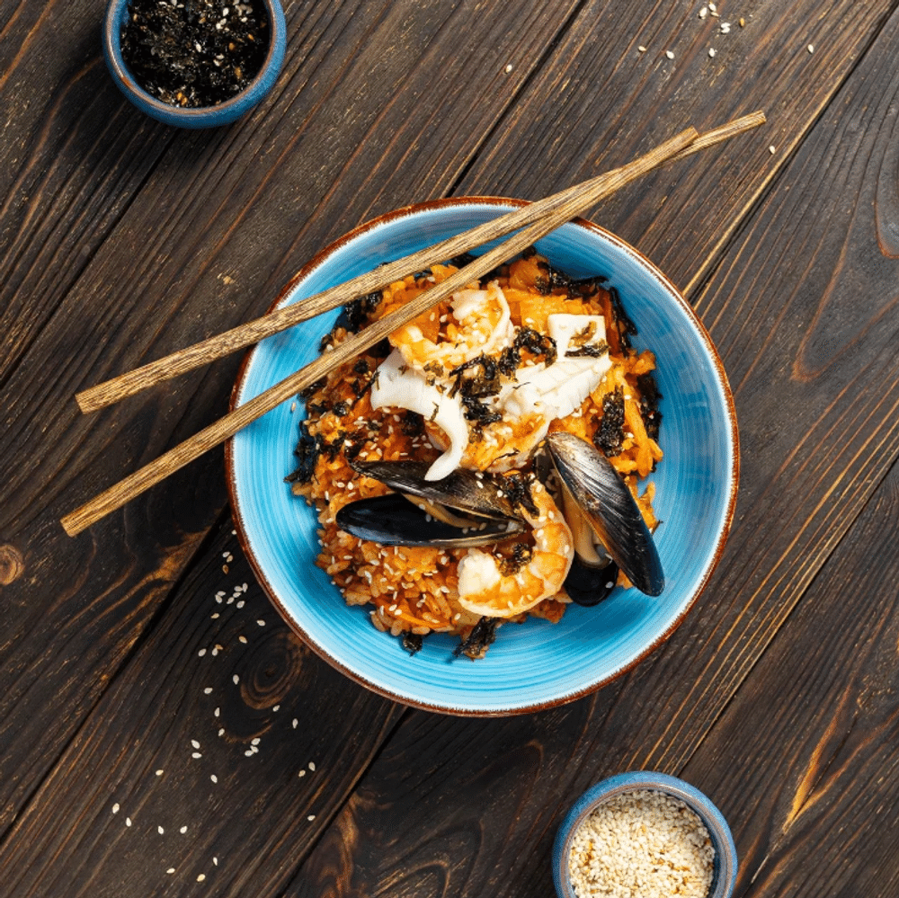 Острое блюдо из риса, обжаренного с кимчи и морепродуктами (очищенные королевские креветки, мидии, кальмары). Острота средняя