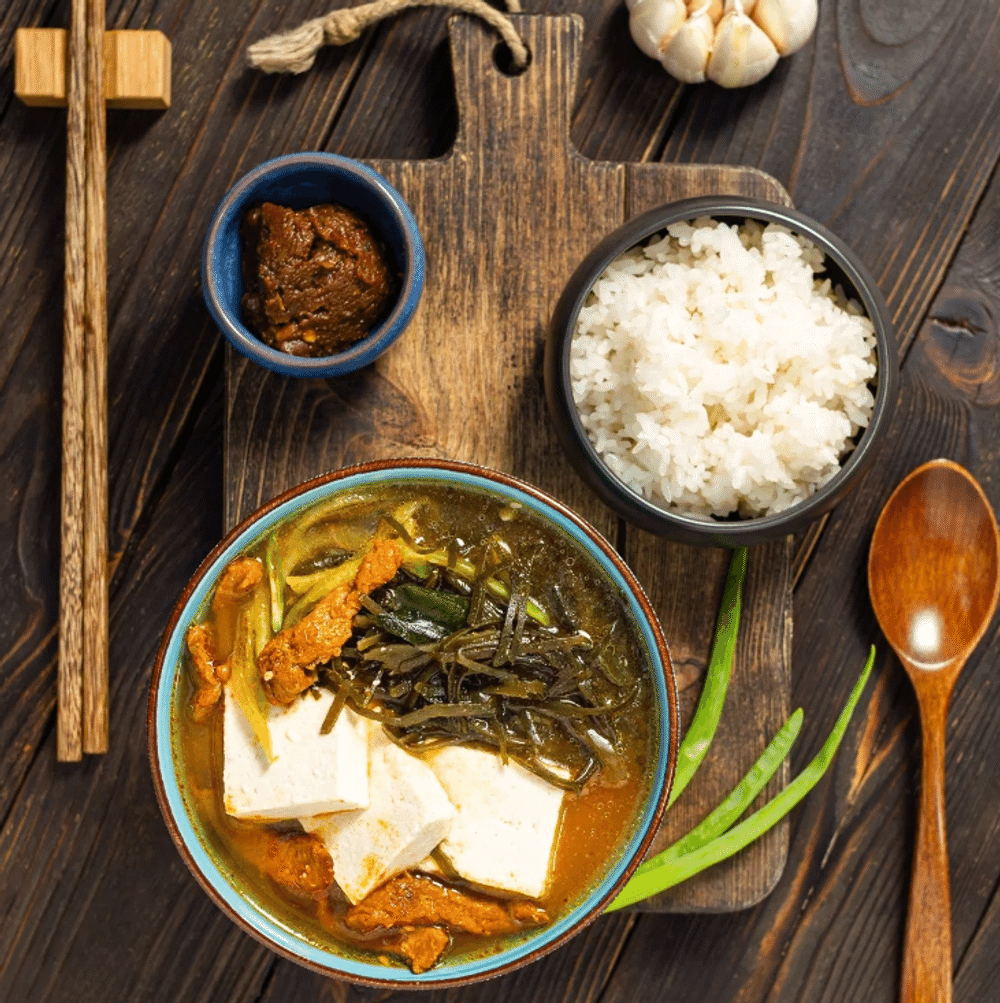Суп с морской капустой, дайконом, мясом, соевой пастой, тофу и зеленым луком. Подается с рисом. Soup with seaweed, daikon, meat, soy paste, tofu and green onions. Served with rice.